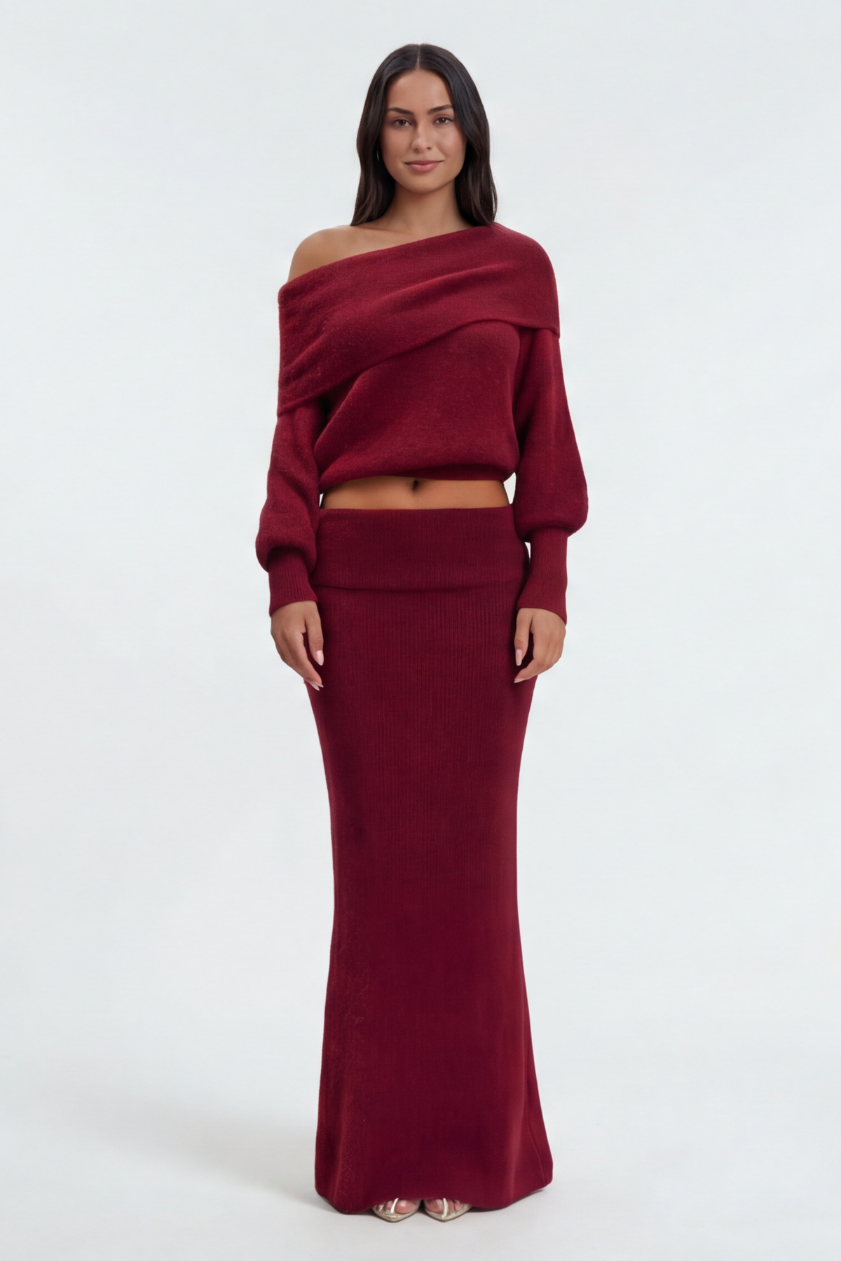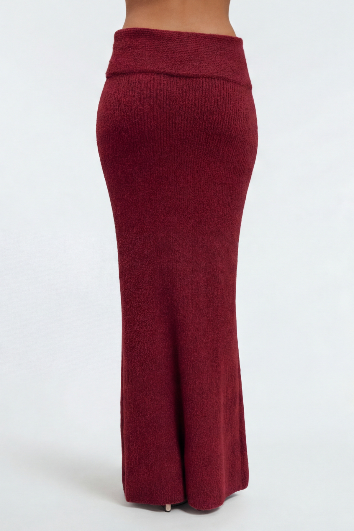 VELONA Merlot Knit Maxi Skirt with Elegant Overlay