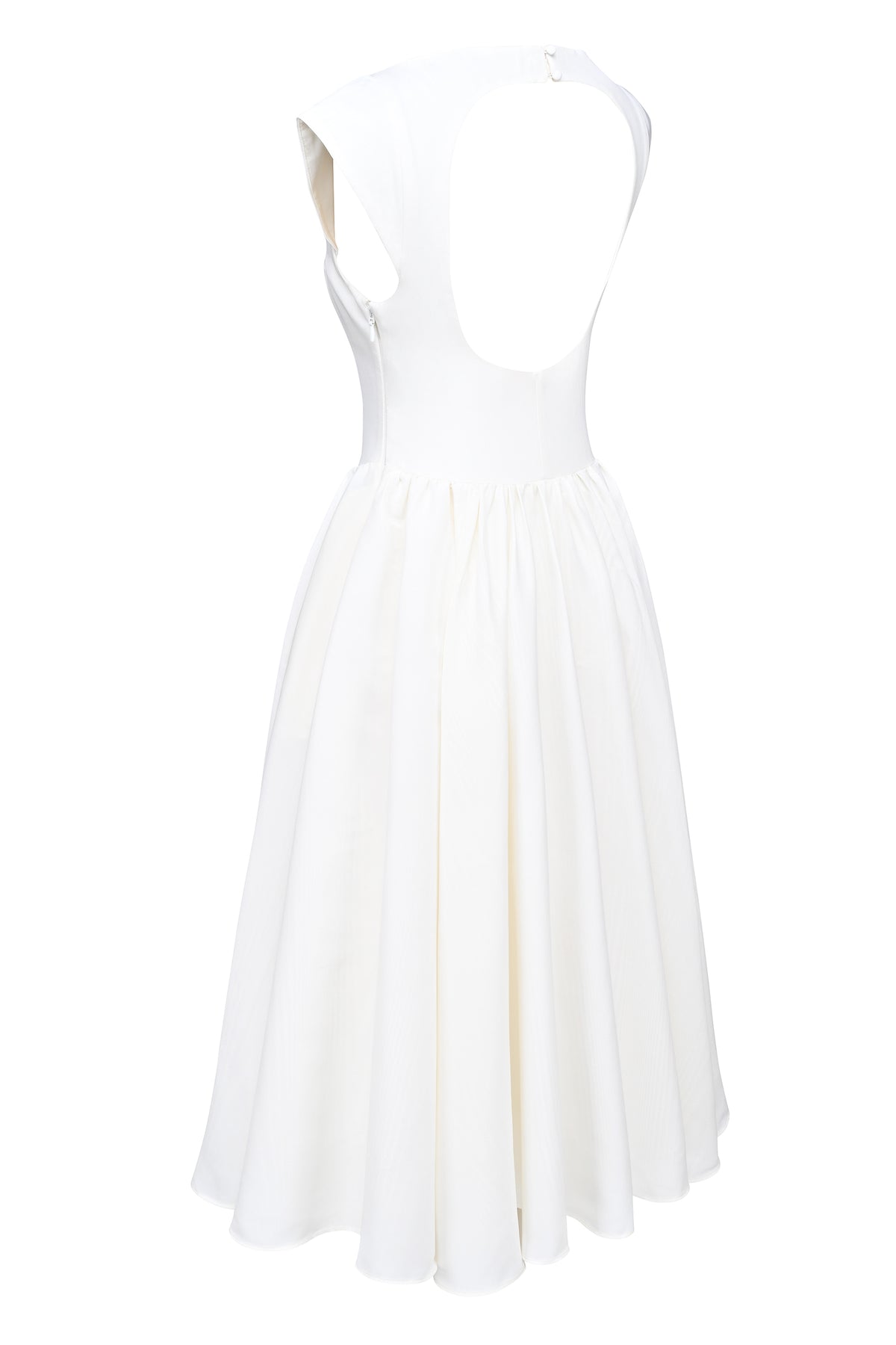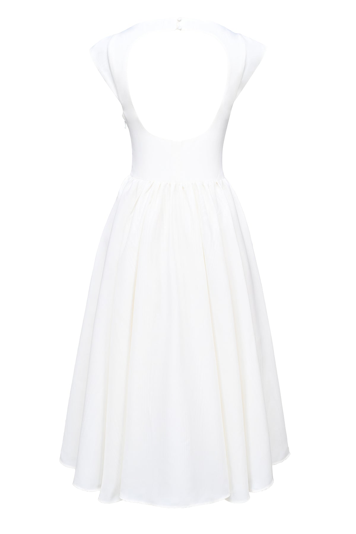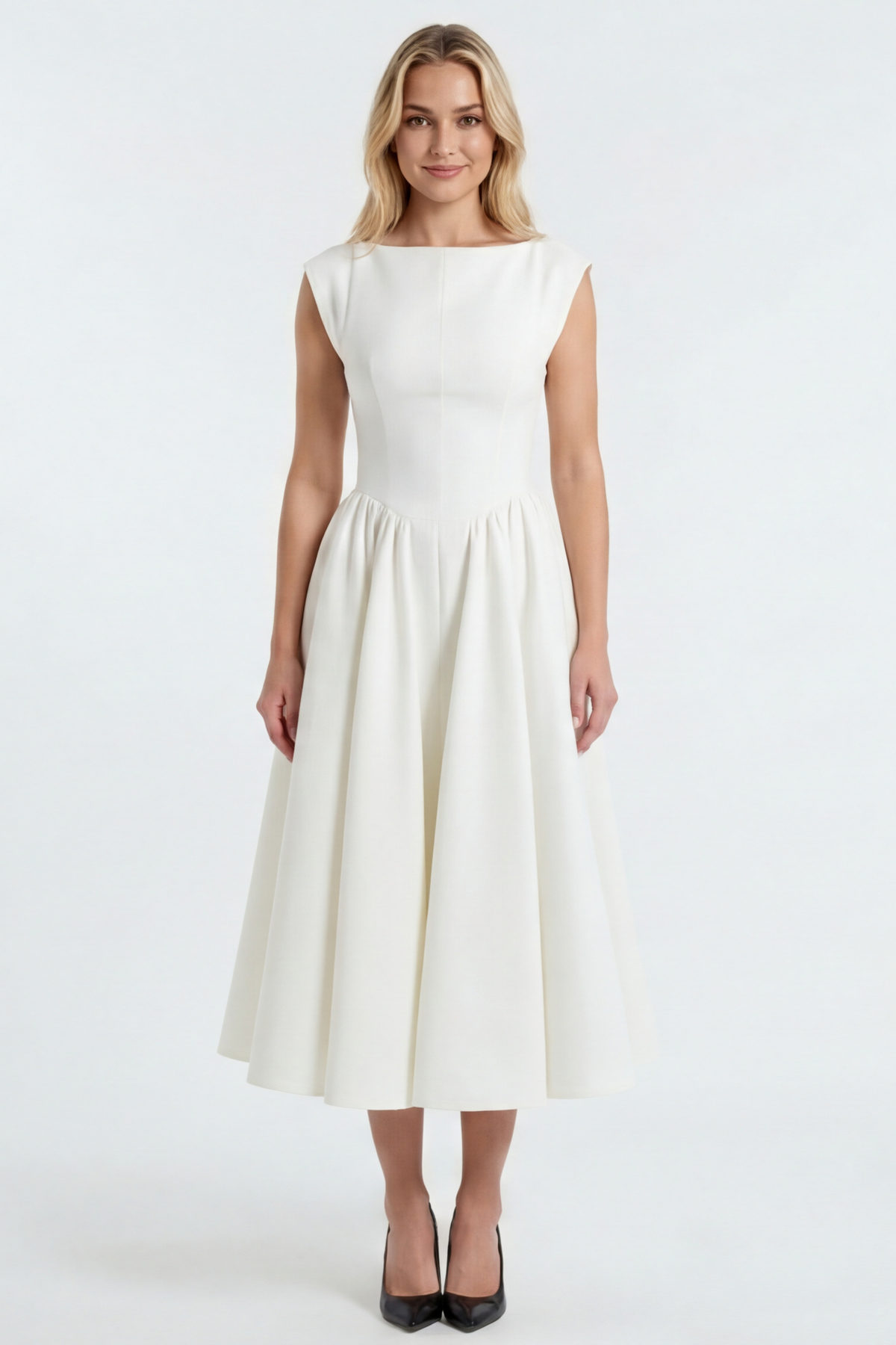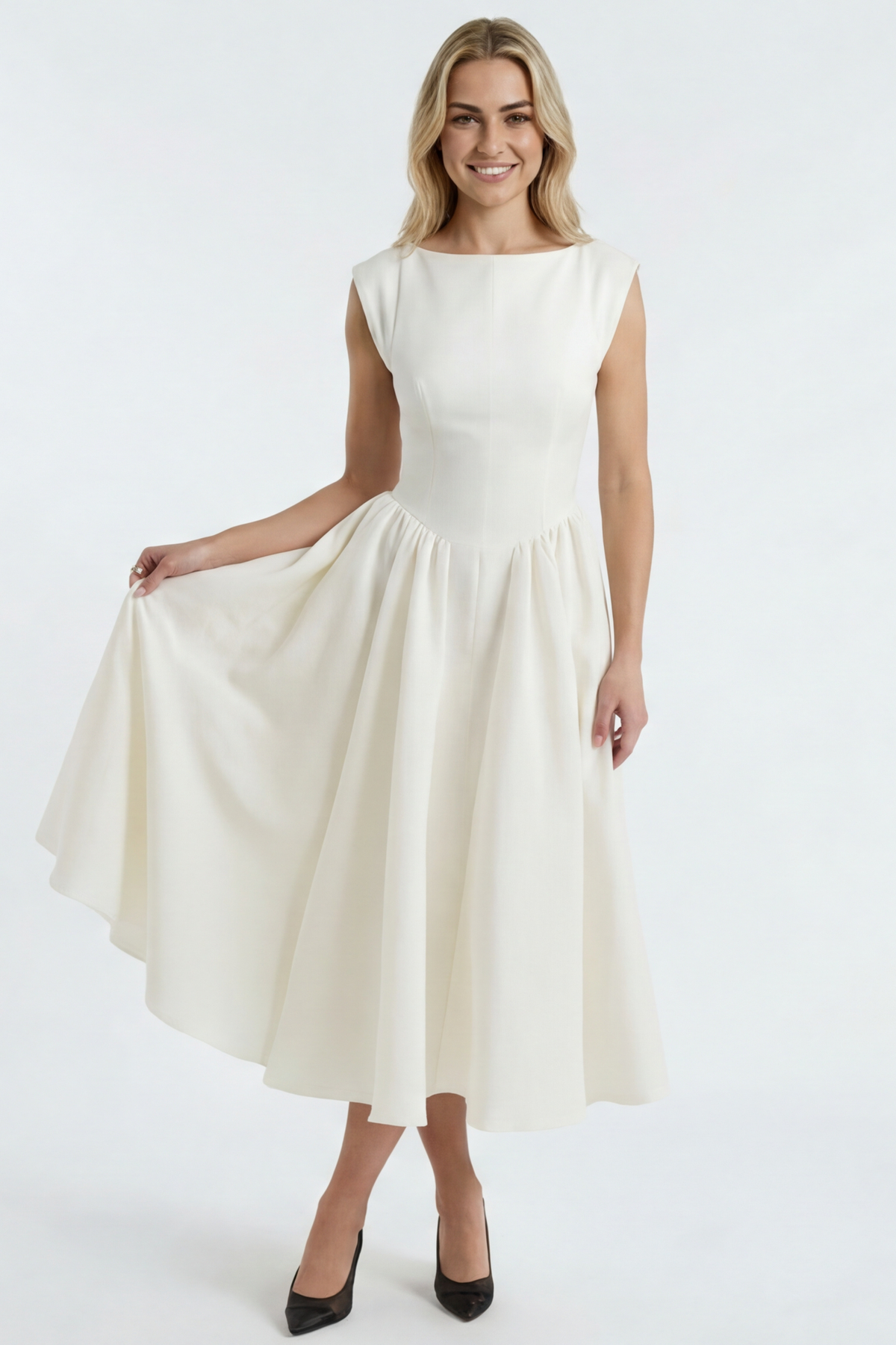 The VELONA Debutante Midi Dress is crafted from luxurious moiré satin and features a flowing full skirt, elegant backless design, and soft structure for a timeless, feminine look.